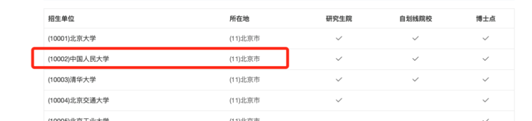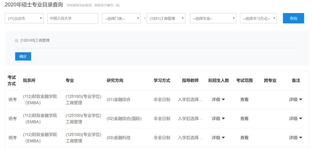 这样,中国人民大学的所有详细信息,包括本专业所在院系所、研究方向、学习方式、招生人数、考试范围等等都会一览无遗。