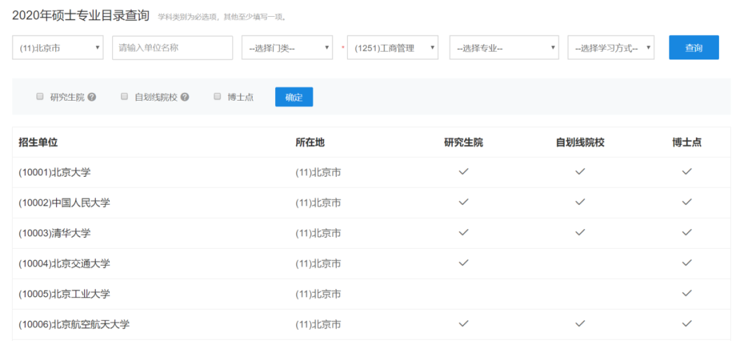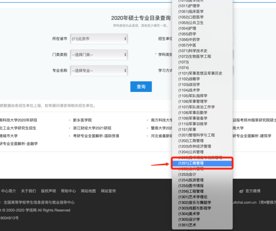 比如小编想查询北京市开设1251工商管理专业(即MBA)的院校:
