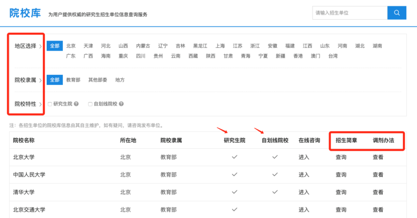 同学们可以看见,院校库里可以通过地区、院校隶属、院校特征进行院校筛选,对应每个院校,可以在咨询开放时间段与高校老师进行在线咨询,以及查询高校研究生招生简章和调剂办法。也可以直接点击高校名称,进入高校详情页面进行浏览。