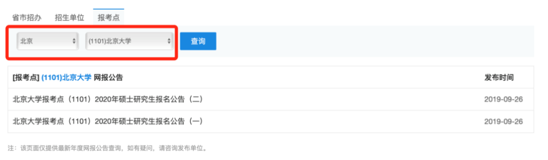 二、如果你想在某个地方考试,但是不清楚自己是否可以选择这个报考点,那么可以查看该报考点的网报公告(这里会在考研报名阶段集中展示),比如我想查询北京市的北京大学报考点如图: