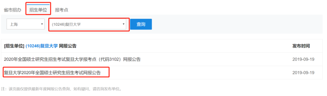 再比如你想考某个高校,你不知道报这个高校有什么网报要求,那么可以查看该招生单位的网报公告,比如上海的复旦大学:
