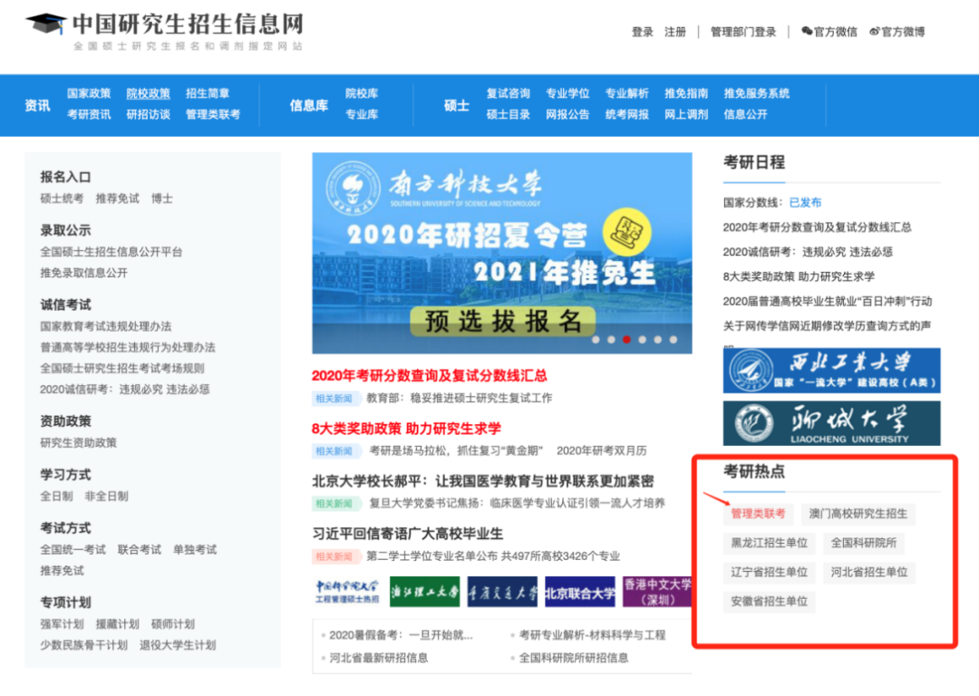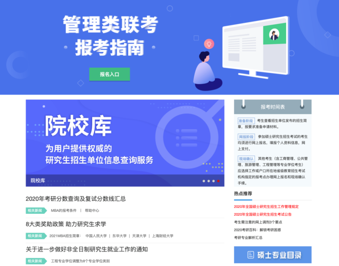 点击考研热点中的管理类联考按钮,直接跳转专题页面,可查询关于管理类联考的一些针对性内容,比如报考流程,复试分数线等信息。