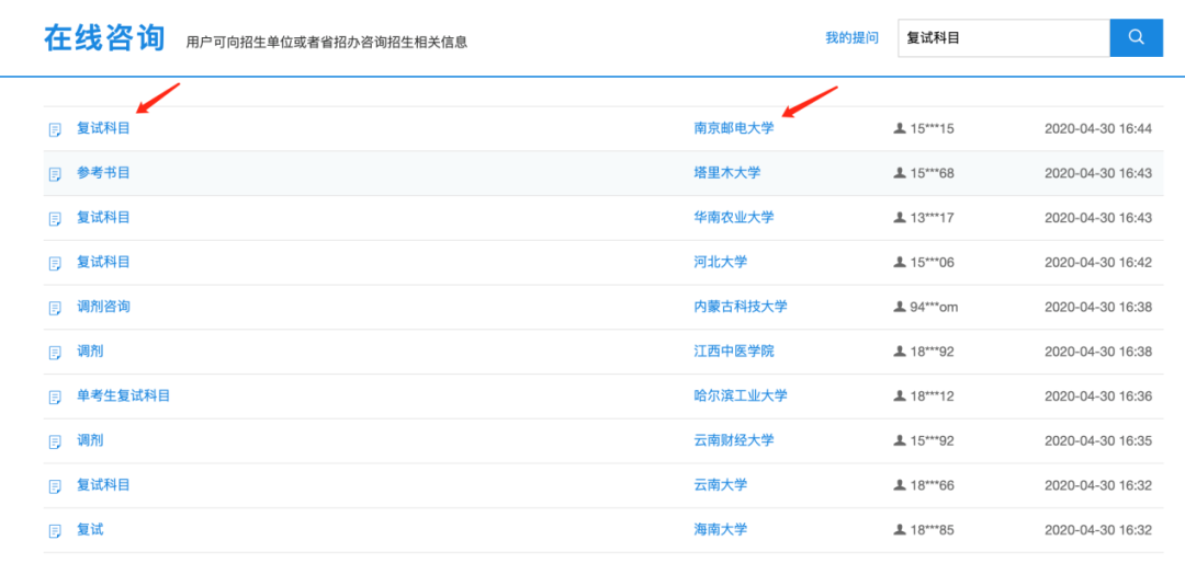 比如小编搜索的是“复试科目”,就会有所有的各院校的关于复试科目相关问题的回复信息。