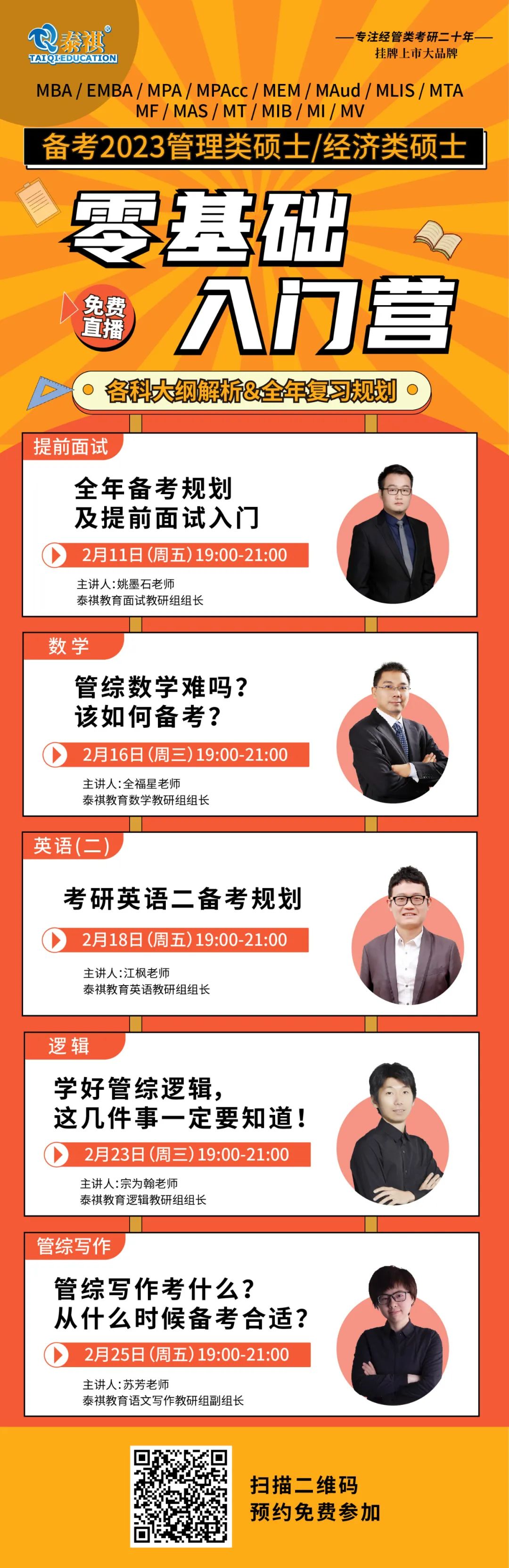 为了帮助同学们快速了解管理类专硕的考试大纲,对全年的备考有个总体的规划,做到心中有数。泰祺教育专门打造了零基础入门营,扫清大家备考初期的迷茫困惑,助力同学一战成硕!